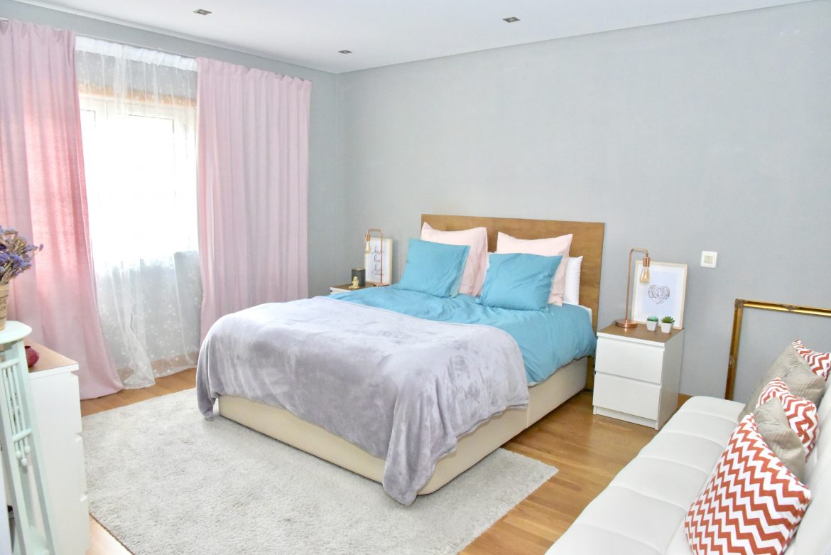 Queria dar um look mais descontraído, leve e luminoso, basicamente neste refresh apenas alterei edredon, cortinados, forrei a cabeceira e as mesasinhas, alterei os candeeiros e as molduras por apenas 201€.
